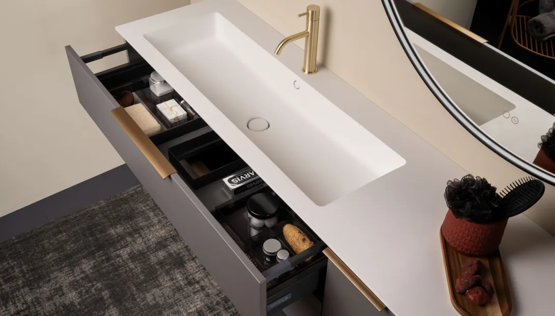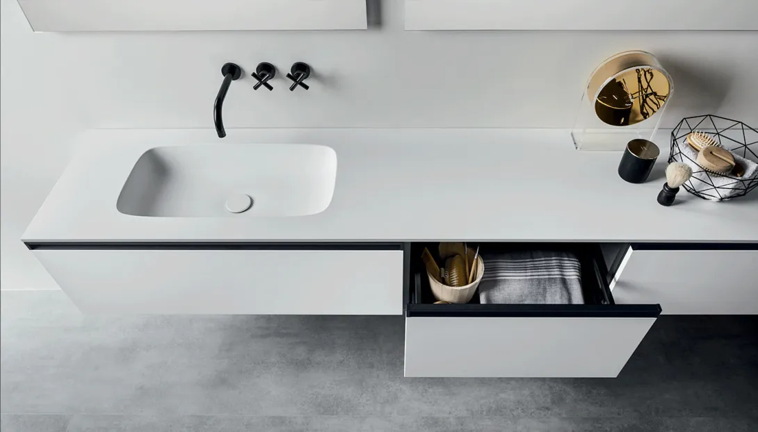 - Kombinierbar mit integrierten Becken, Aufsatzwaschbecken, offenen Elementen und Unterschränken