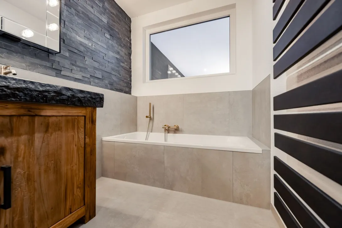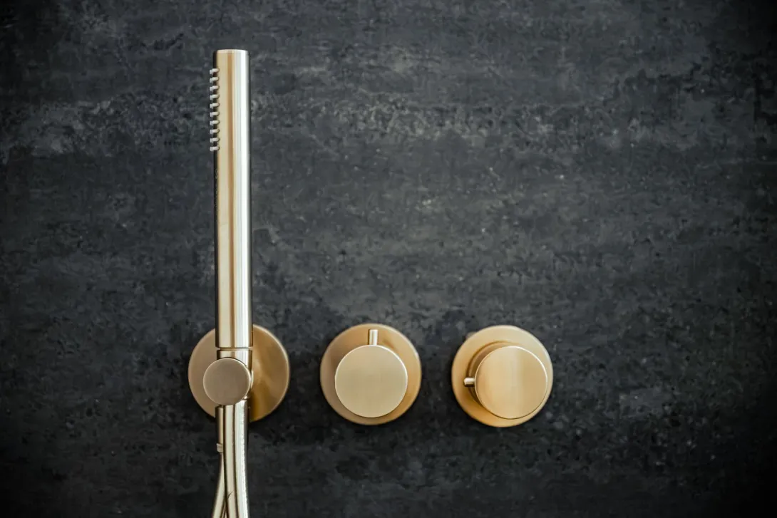 | Besonderes: | Kombination aus schwarzen Fliesen und goldenen Armaturen, ergänzt durch eine großzügige, moderne Deckenkopfbrause sowie ein Fenster in der Zwischenwand für zusätzlichen Lichteinfall. |
