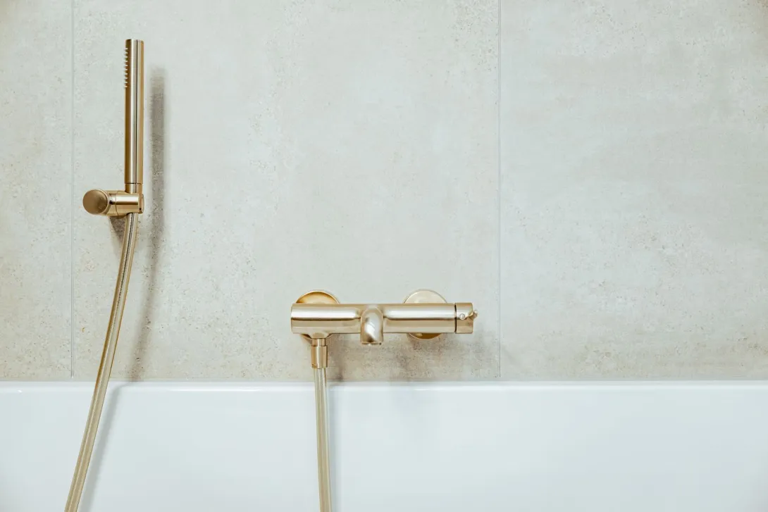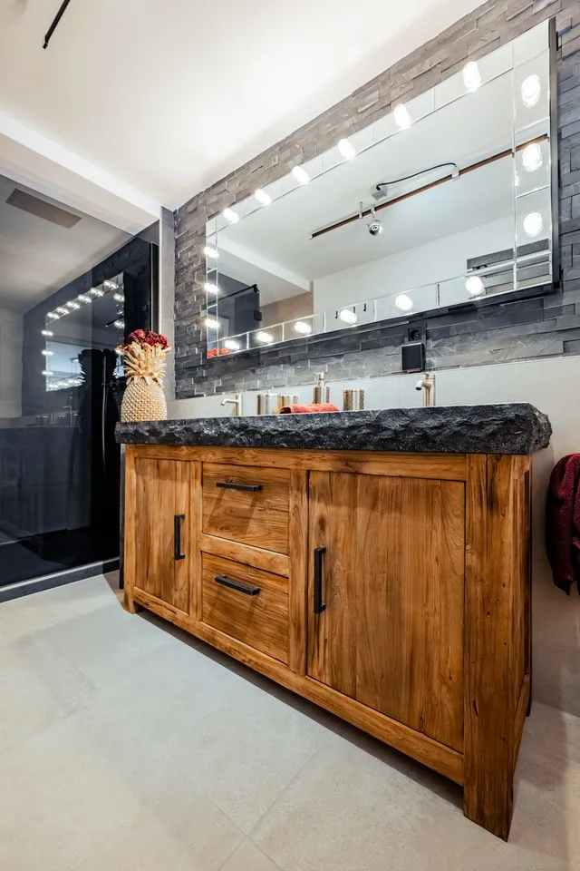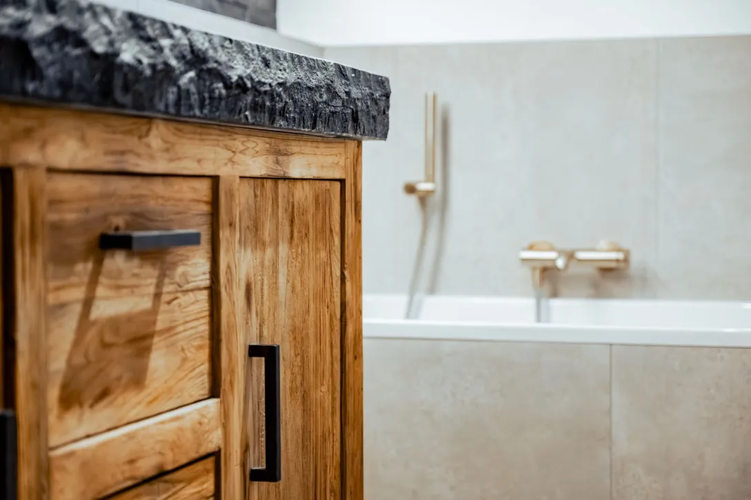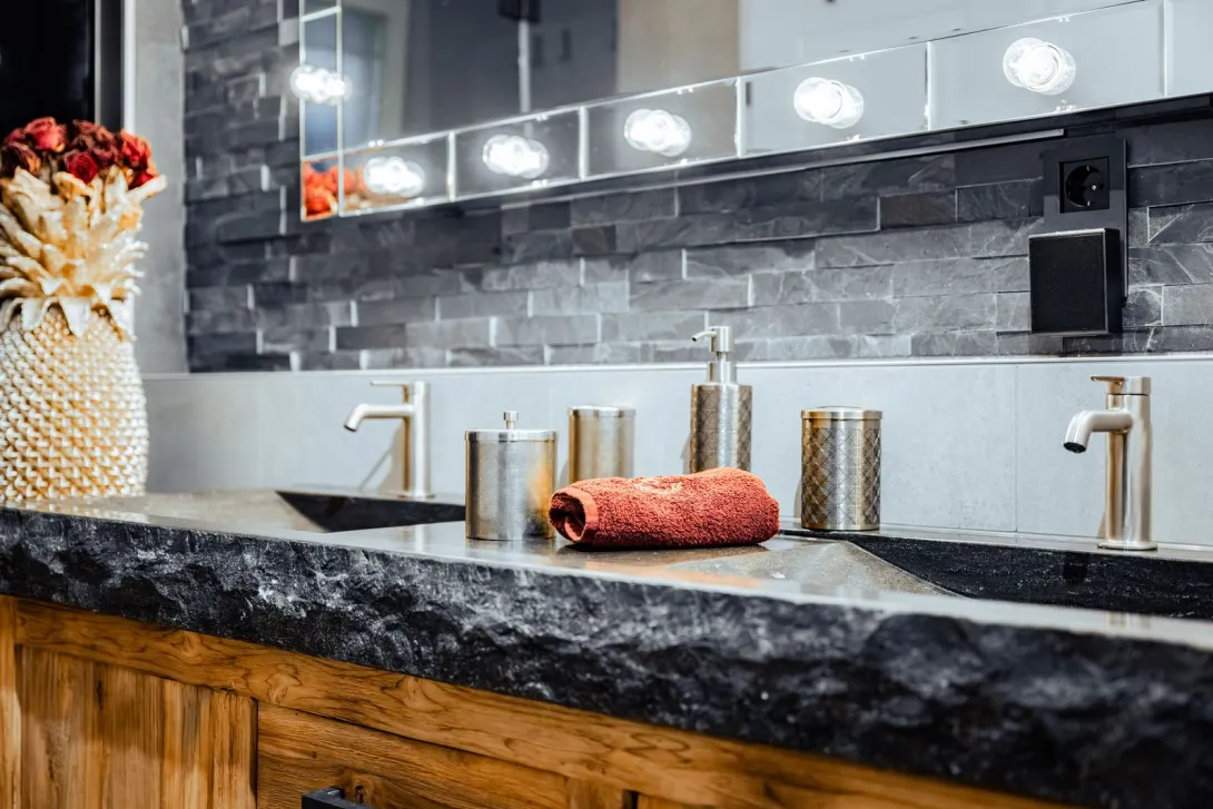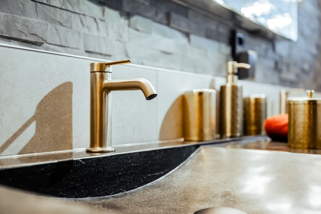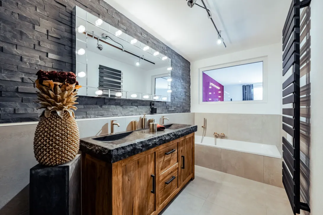 Bad mit stilvoller Schwarz-Gold-Ästhetik